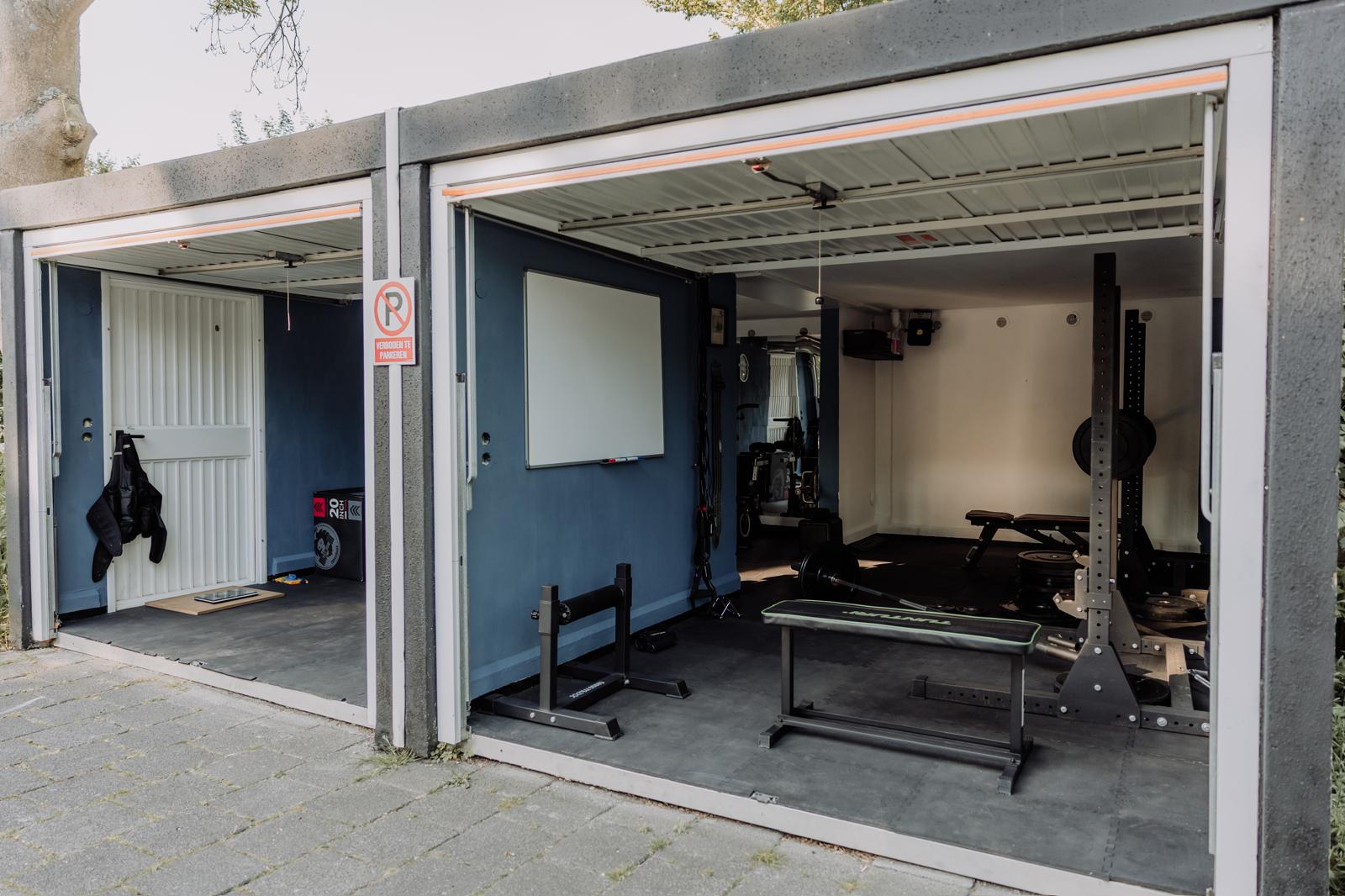 Dit is mijn PT-ruimte: kracht en cardio, half binnen en half buiten. Geen standaard sportschool, maar ruimte om te bewegen, te ademen en sterker te worden.